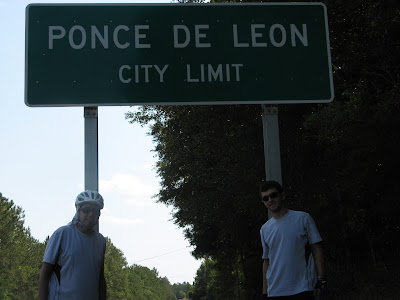 We left the Comfort Inn in Marianna this morning at 7:00 with breakfast to- go. While our trip was still in the planning stages, Shafiq from Danny Cycles Bike Shop (Stamford, CT) spent many hours with us, advising us on what bikes to get (even though he knew we were going to be buying the bikes in Tallahassee) teaching us how to maintain our bikes and telling us what to expect on the road. One of the most valuable things Shafiq told us has been the importance of biking early in the morning and delaying breakfast until after putting 1/3 of our day's miles behind us. We tried this today and brought some english muffins, peanut butter packets, and jelly from the hotel in our bags. Shafiq's advice was great We drank a lot and rode 20 miles before we were even hungry. We stopped for breakfast in the shade on the side of the road and continued on our way. Around mid- day temperatures reached 107 degrees and we took shelter in a gas station where we drank Powerade and relaxed at a table set up in the back of the adjoined convenience store. As in the past, many people during the day asked us where we were headed and proceeded to tell us stories of what they have done and/or what they planned to do. Spending an hour or two at a mini mart has been a cultural revelation. People are extremely friendly. Everybody smokes, drives pickup trucks, and they sell beer and beef jerky as quickly as they can stock the shelves. We stayed there for about an hour and a half, and decided to continue in order to reach Ponce De Leon, Fl, named after the famous explorer who claimed to have found the Fountain of Youth (people must have been laughing at his funeral) . We took a quick dip in the 'fountain' and felt good enough to push the last 11.5 miles to DeFuniak Springs. At the Ponce De Leon fountain we noticed another Surly bike, fully loaded, up against a tree. The owner of the bike - a woman, told us that she had traveled on the same route going west to east. She had left San Diego 6 weeks ago and hoped to finish in about a week. We didn't get to ask her a lot of questions but the thought of doing this trip alone is quite scary. The terrain today was especially flat, except for the last 10 miles which made us wish we had stayed at Ponce de Leon. We basically followed Route 90 all day. The theme of the day was definitely - who let the dogs out. We had dogs barking at us about 10 times today. The good news was seven of those times the dogs were behind a fence. The bad news was 3 times we were chased by the dogs (sometimes multiple dogs) We had read a lot about dogs instinctively chasing bikes on other blogs and brought mace for both our bikes. Coby has developed a quick draw for the mace spray - grabbing it and arming it in one motion. Fortunately we were able to outrun all our dog encounters today. The dogs we saw were not the breeds we see in the northeast, but rather look to us like they came right out of a Harry Potter movie - quite scary. We had originally thought nothing could make us ride faster than seeing lightning on the horizon. Today we realized that no matter how tired we are, we could go even faster being chased by dogs.